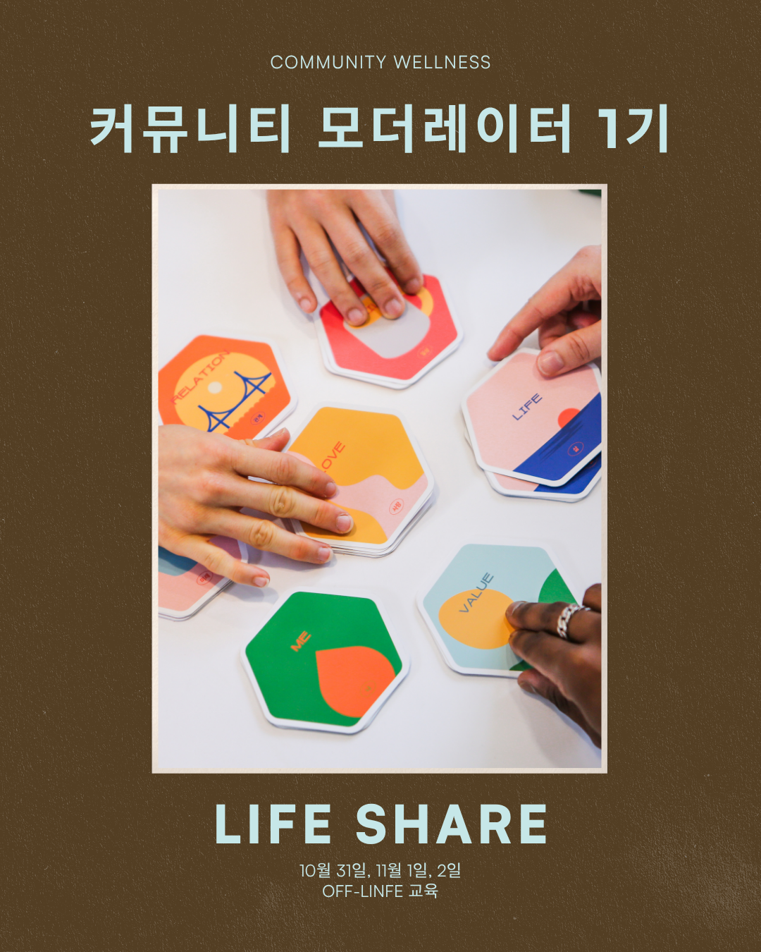 📍라이프쉐어 커뮤니티 모더레이터 Essential 1기 * 일시 : 10월 31일, 11월 1일, 2일 오전 10시 - 오후 6시 * 장소 : 이너시티 합정 * 신청 : 프로필 링크 or 라이프쉐어 홈페이지 * 인원 : 최대 12명(현재 얼리버드 할인 중)