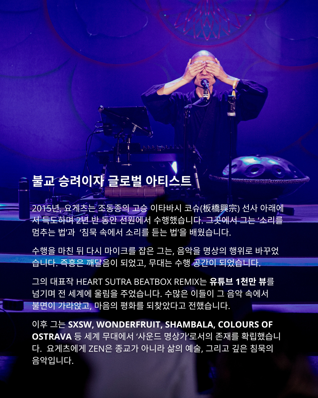 그의 목소리는 루프 머신을 통해 무한히 확장되어, 염송(Chanting)과 일렉트로닉 리듬이 교차하는 순간, 당신은 사운드의 파동 속에서 내면의 고요를 만나게 됩니다.